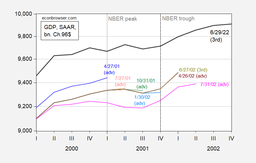Figure 1: GDP in billions Ch. 1996$ SAAR. NBER defined peak and trough dates at dashed lines. 6/29/22 GDP calculated dividing nominal GDP by GDP deflator rescaled to 1996=100. Source: BEA via ALFRED, NBER, and author’s calculations.