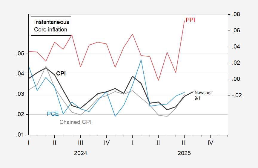 Figure 1: Instantaneous inflation for core CPI (black, left scale), chained core CPI (gray, left scale), core PCE deflator (light blue, left scale), core PPI (red, right scale). Core PCE inflation for August is Cleveland Fed y/y nowcast as of 9/1. All per Eeckhout (2023), T=12, a=4. Source: BLS, BEA, via FRED, and author’s calculations.
