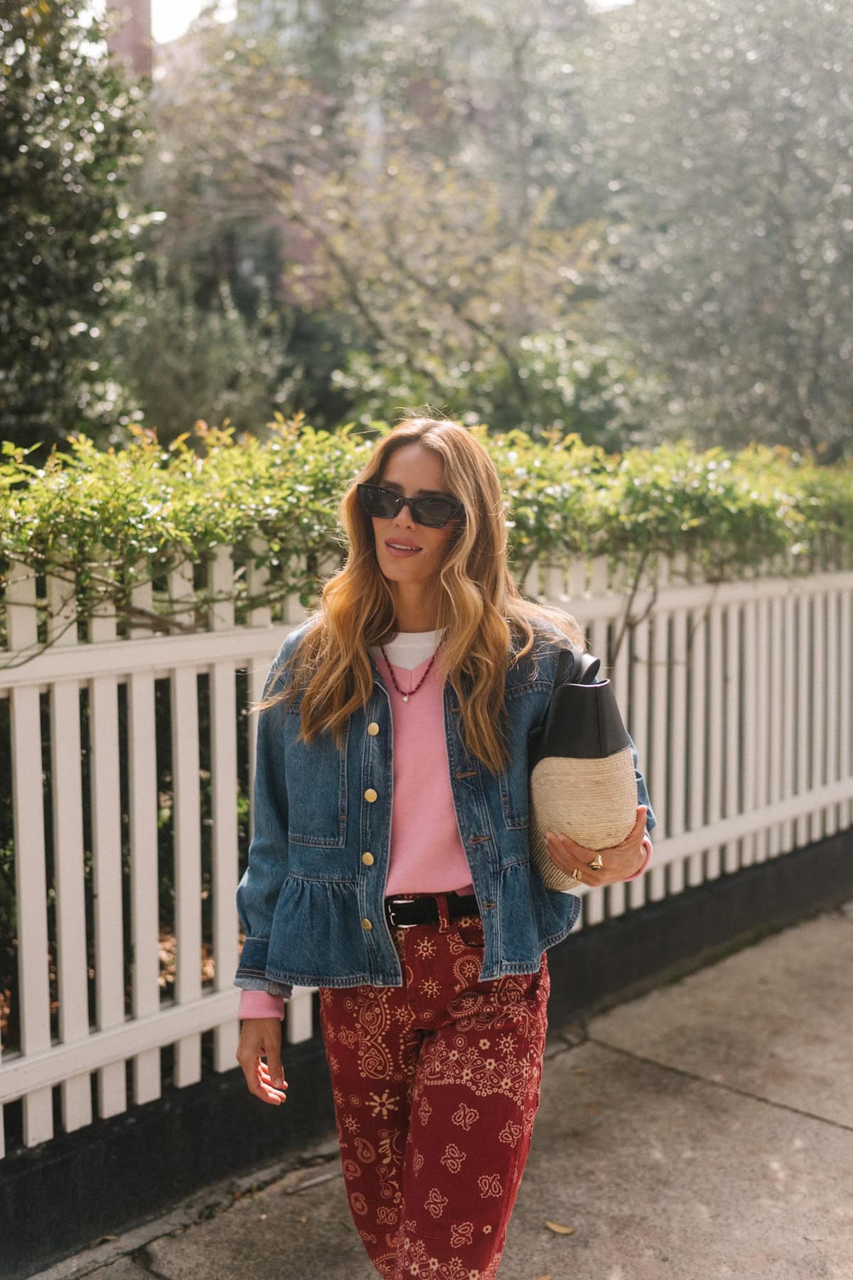Ulla Johnson Jacket, Amazon Sweater, Tee & Jeans, Nour Hammour Belt (similar here and here), Chanel Flats (on The RealReal, similar here), Altuzarra Bag, Dior Sunglasses