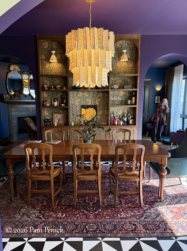 Let’s start in the heart of the home: a purple-walled dining room with William Morris wallpaper backing built-in shelving. It’s the same wallpaper, in a different colorway, as in the Studio Burgoon powder bath. It’s interesting to see which particular design elements pop up in multiple houses on the tour.