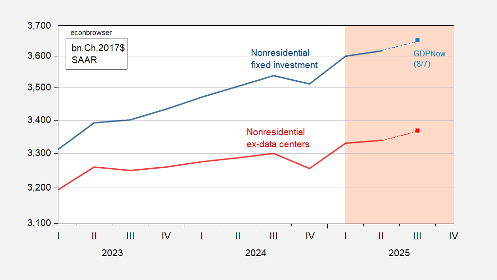 Figure 1: Nonresidential fixed investment (blue) GDPNow of 8/7 (light blue square), nonresidential fixed investment minus data center capex (dark red), GDPNow of 8/7 (red square), all in bn.Ch.2017$ SAAR. Annual data center capex interpolated using cubic spline. Assumes information processing equipment prices rise by 0.9% in Q3. Source: BEA, Atlanta Fed, JPMorgan, and author’s calculations.