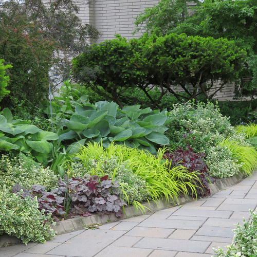 This pathway is near the front of the house. In the back there are Yews on either side of a Rose Glow barberry (Berberis thunbergii ‘Rose Glow’, Zones 4–8) and Black Lace elderberry (Sambucus nigra ‘Eva’, Zones 4–7). The other plants are several variegated euonymus, Silver Scrolls heuchera (Heuchera ‘Silver Scrolls’, Zones 4–9), hostas, All Gold Japanese forest grass, Palace Purple heuchera (Heuchera micrantha var. diversifolia ‘Palace Purple’, Zones 4–9) and a Catching Fire heucherella (Heucherella ‘Catching Fire’, Zones 4–9).