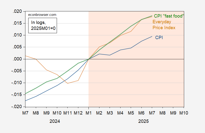 Figure 1: CPI (blue), Everyday Price Index (tan), and CPI-limited service restaurants (green), all in logs, 2025M01=0. CPI-limited services restaurants seasonally adjusted by author using X-13 in logs. Source: BLS, American Institute for Economic Research, and author’s calculations.