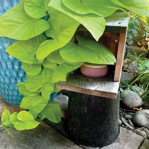 An unfinished birdhouse set on a pot makes a fine protective shelter for a smart speaker in the garden. Add a sweet potato vine trailing down from a neighboring planting pot, and no one will know where the background ambient sound is coming from. The shelter protects the electronic device from the occasional summer rain shower or a wayward squirt from a watering hose.