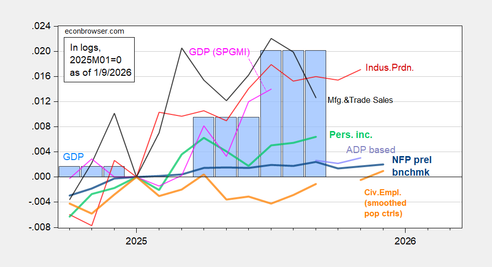 Figure 1: Implied NFP preliminary benchmark revision (bold blue), ADP based author’s estimate of November NFP (light blue), civilian employment with smoothed population controls (bold orange), industrial production (red), personal income excluding current transfers in Ch.2017$ (bold light green), manufacturing and trade sales in Ch.2017$ (black), and monthly GDP in Ch.2017$ (pink),GDP (blue bars), GDP (blue bar), all log normalized to 2025M01=0. Source: BLS, ADP, via FRED, Federal Reserve, BEA 2025Q3 initial release,S&P Global Market Insights (nee Macroeconomic Advisers, IHS Markit) (9/2/2025 release), and author’s calculations.