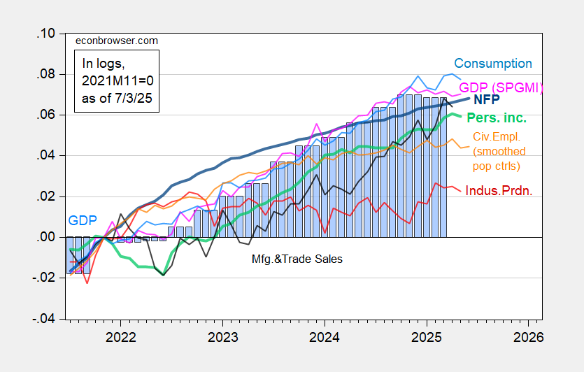 Figure 1: Nonfarm Payroll incl benchmark revision employment from CES (bold blue), civilian employment using smoothed population controls (orange), industrial production (red), personal income excluding current transfers in Ch.2017$ (bold light green), manufacturing and trade sales in Ch.2017$ (black), consumption in Ch.2017$ (light blue), and monthly GDP in Ch.2017$ (pink), GDP (blue bars), all log normalized to 2021M11=0. 2025Q1 GDP is third release. Source: BLS via FRED, Federal Reserve, BEA, S&P Global Market Insights (nee Macroeconomic Advisers, IHS Markit) (7/2/2025 release), and author’s calculations.