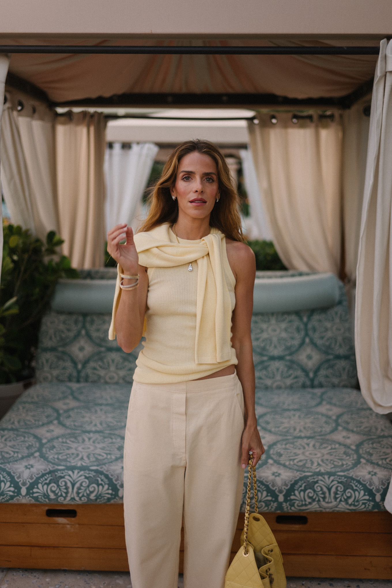 In Palm Beach, I wore a Lisa Yang knit tank with the coordinating sweater draped over my shoulders, paired with Leset straight-leg trousers. I kept the palette tight and finished it with my Chanel 25 quilted bag and Proenza Schouler heels in a matching golden tone. The pieces stayed within the same color family, letting knit, tailoring, and quilting create dimension.