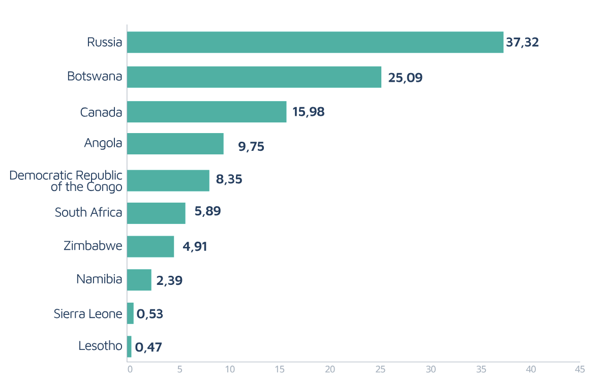 And they are sources of income for the countries that produce them, as well as those that cut them. Below is a table of top producers. Botswana is De Beer’s biggest supplier and holds a minority stake.
