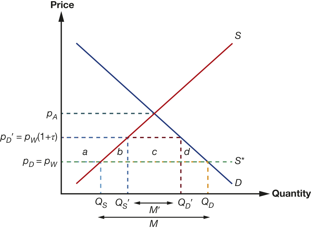 However, as is known from basic economics (like the kind one learns in first course econ in undergrad, or even high school), import competing domestic firms also raise their prices. Hence, the prices are raised for quantity M, as well as quantity Qs. In the figure above, this doesn’t change much. However, consider an alternative, where domestic production is much larger relative to imports: