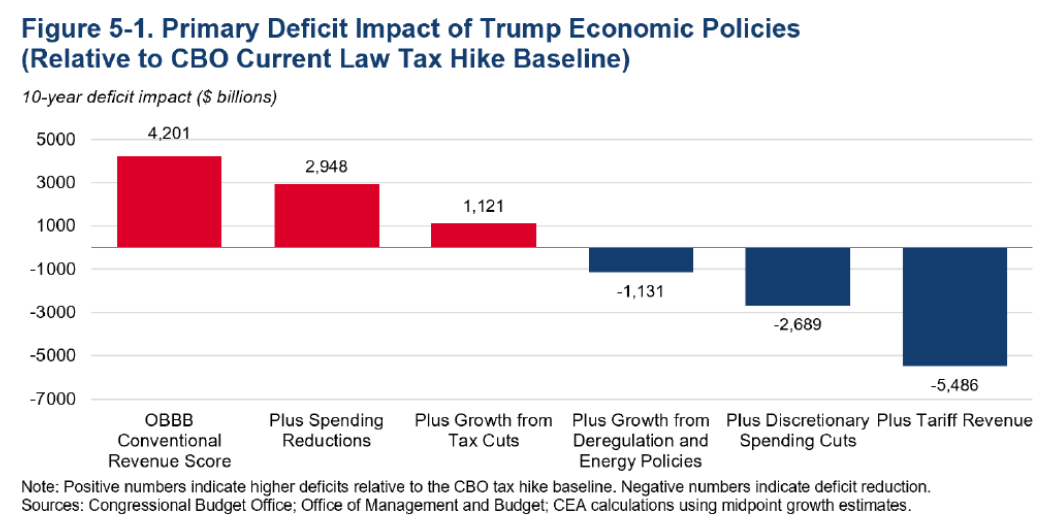 Note the cumulative impact is $2.251 trillion deficit reduction (this is relative to current law baseline, not current policy baseline, shown in CEA (2025) figure 2).