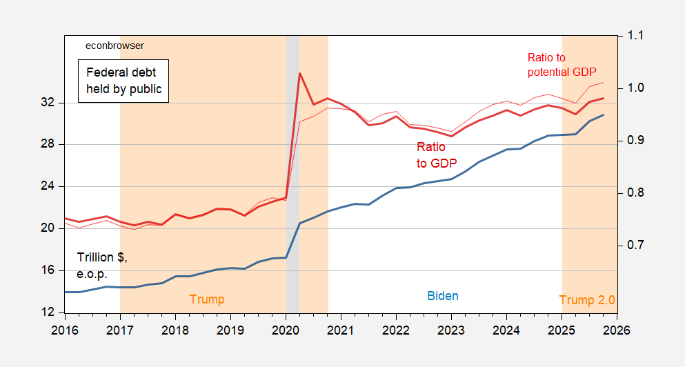 Figure 1: Federal debt held by the public, trn $, end-of-period (blue, left log scale), ratio to nominal GDP (red, right scale). 2025Q4 nominal GDP uses September CBO Economic Outlook projection growth rate. Source: FYGFDPUN from Treasury, BEA via FRED, Treasury, CBO and author’s calculations.