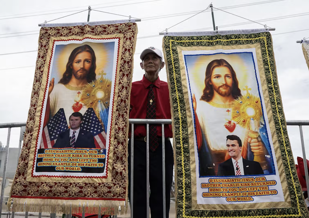 A supporter of Charlie Kirk holds banners outside State Farm Stadium in Glendale, Ariz., during Kirk’s public memorial service on Sept. 21, 2025. Andrew Caballero-Reynolds/AFP via Getty Images