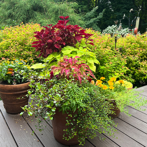This grouping of containers on Cindy’s deck is a delicious mix of citrusy colors, and a large planting of Candy Corn spirea (Spiraea japonica ‘NCSX1’, Zones 4–8) is the perfect complement in the background.