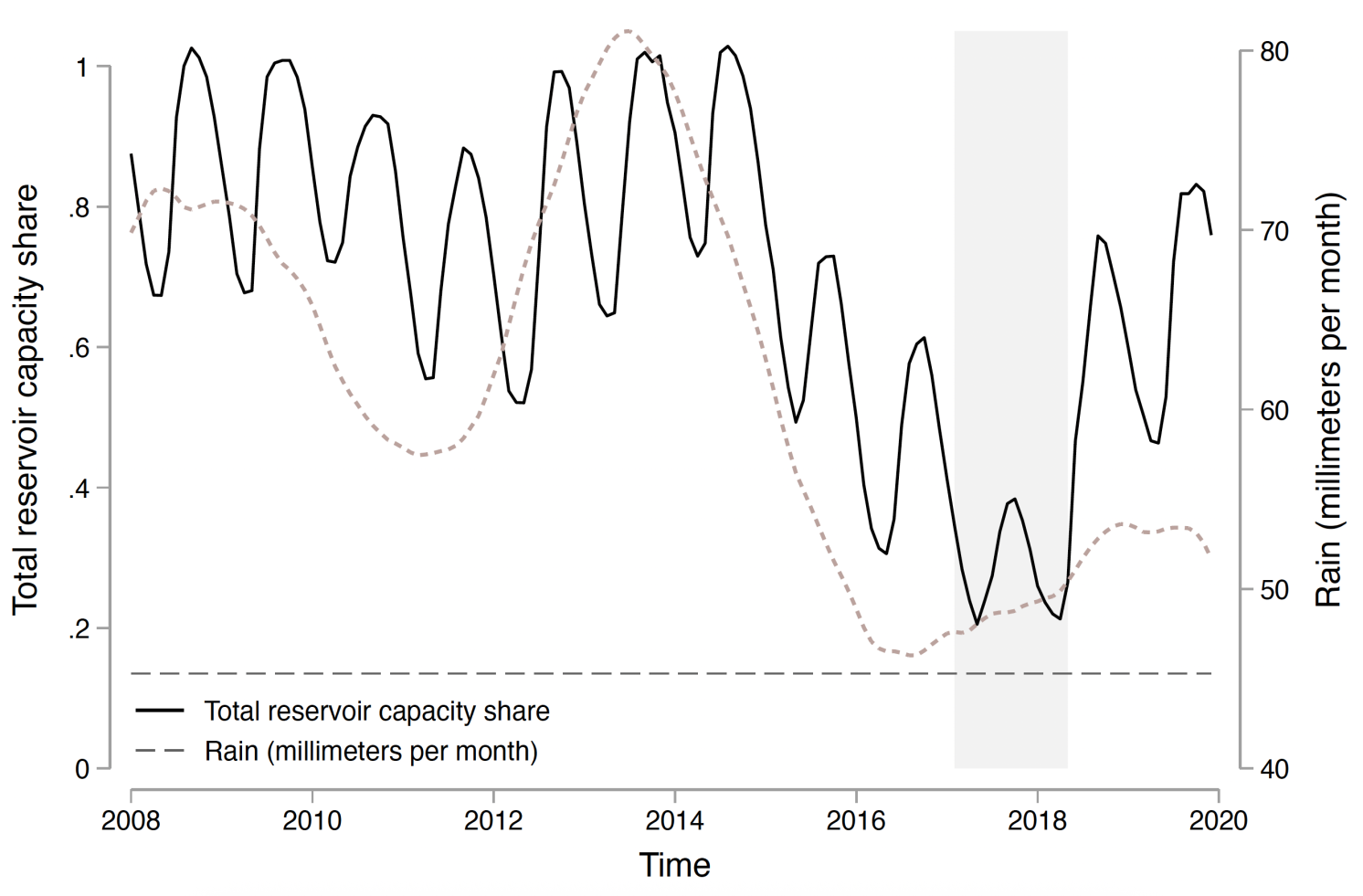 Cape Town is the second largest city in South Africa, and relies heavily on natural rainfall as a source of municipal water supply (City of Cape Town 2020). The city uses an increasing block tariff (IBT) pricing model for municipal water to cross-subsidise the consumption of low-income households. The IBT allows these consumers to pay subsidised rates while charging high consumers above marginal cost to cover the subsidies. However, as shown in Figure 1, a multi-year drought beginning around 2015 began to render existing consumption patterns unsustainable. During the drought (the shaded region in Figure 1), the city’s reservoirs were depleted to near the critical level associated with Day Zero (the horizontal dashed line at 13.5 percent). Starting in 2017, the municipality began to take unprecedented measures to reduce consumption, including steep price increases, usage restrictions, and public information campaigns.