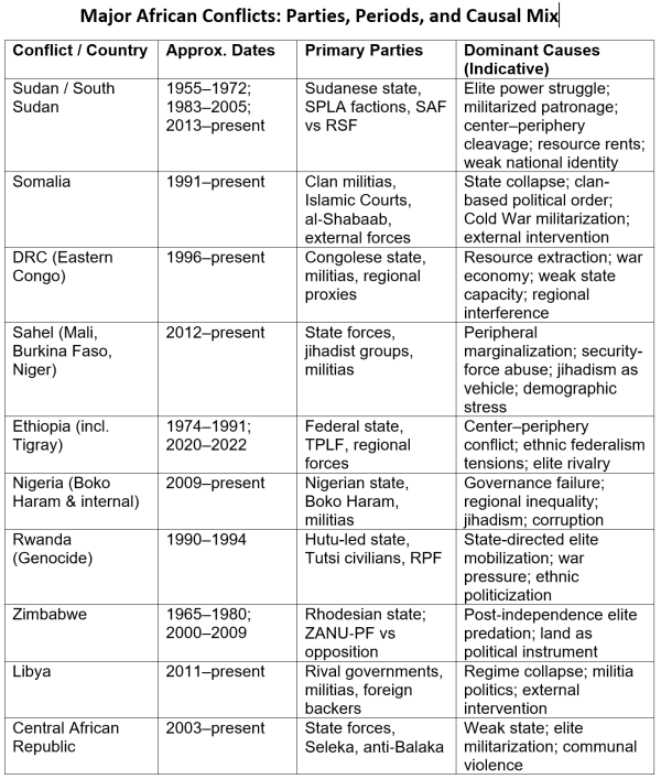 This diversity alone should dispel the notion that Africa’s wars share a single cause. They do not. They share overlapping pressures, combined in different proportions. The conflict causes listed in the table below are indicative of the multiple, interacting pressures that shape conflicts, rather than definitive explanations of any single case.