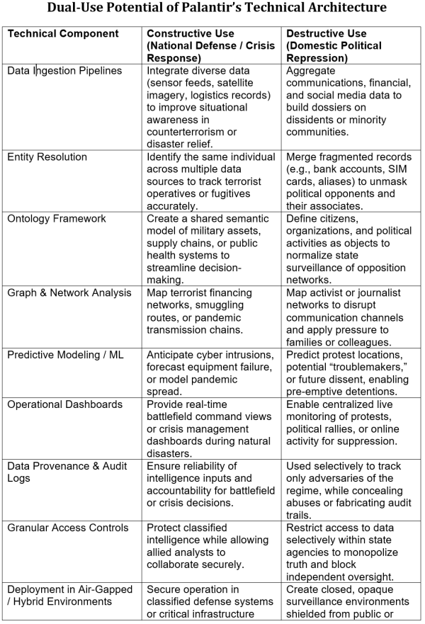 Palantir’s powerful information management tools could thus be employed in an infrastructure of domestic political control. The very features Palantir markets as safeguards—granular access controls, audit logs, and secure provenance—are only as effective as the institutions and personnel that govern their use. In the absence of robust legal frameworks and independent oversight, these technical protections offer little defense against deliberate misuse.