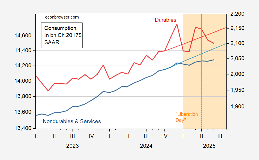 Figure 1: Sum of nondurables and services consumption (blue, left log scale), 2023M11-2024M10 stochastic trend (light blue line, left scale),durables consumption (red, right log scale), 2023M11-2024M10 stochastic trend (light red, right scale), all in bn.Ch.2017$ SAAR. Orange shading denotes Trump 2.0 administration; orange dashed line at 2025M04. Source: BEA, July release, and author’s calculations.