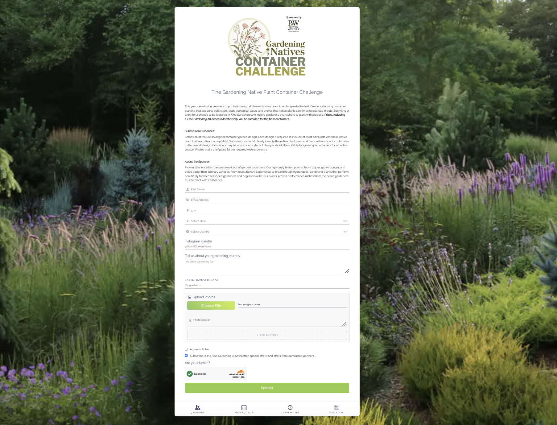 Entries must feature an original container garden design. Each design is required to include at least one North American native plant (native cultivars acceptable). Submissions should clearly identify the native plant used and demonstrate how it contributes to the overall design. Containers may be any size or style, but designs should be suitable for growing in containers for an entire season. Photos and a brief plant list are required with each entry.