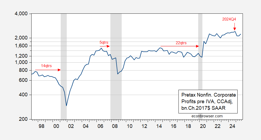 Figure 1: Real pretax corporate profits for nonfinancial firms, bn.Ch.2017$ SAAR (blue). Deflated by personal consumption expenditure deflator. Red arrows denote time from peak profit to NBER peak. NBER defined peak-to-trough recession dates shaded gray. Source: BEA, NBER, and author’s calculations.