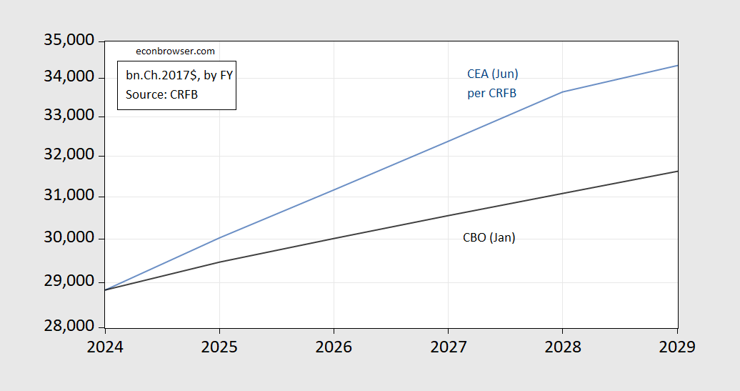 Figure 1: CBO GDP projection from January 2025 (black), implied CEA June forecast (blue), both in bn.Ch.2017$, by fiscal year. Source: CRFB.