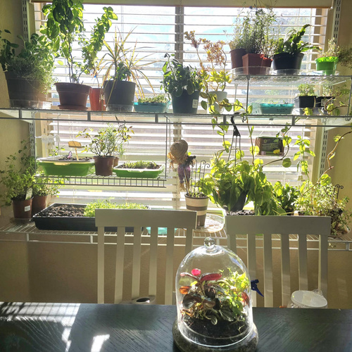indoor garden in front of windowWhen it’s too hot to play outside, I like to have my inside garden: basil, sage, thyme, roses, cactus, terrarium, pothos, mint, lavender, sugar plant, chamomile, marjoram. Start seeds, and just play!