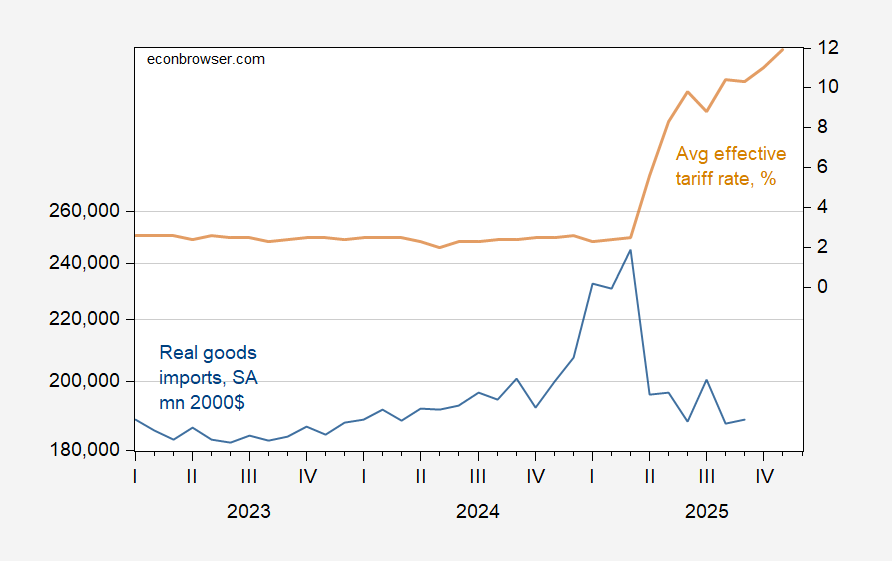 Figure 1: Real imports of goods, seasonally adjusted, in mn.2000$, BoP standard (blue, left log scale), and average effective tariff rate, % (tan, right scale). Source: Census, BLS via FRED, Paweł Skrzypczyński, and author’s calculations.