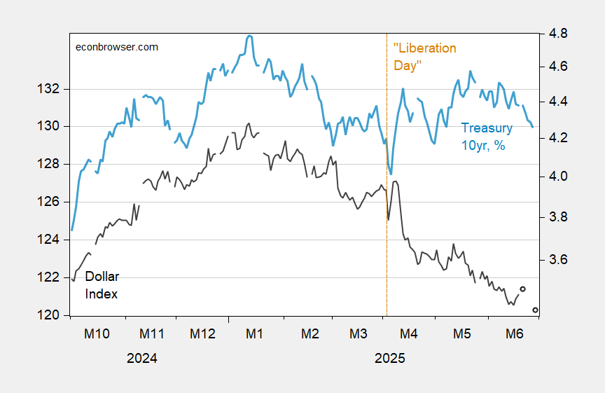 Figure 1: Fed broad dollar index, 2006M01=100 (black, left scale), Treasury 10 year, % (blue, right scale). June 27 observation for nominal dollar is estimated using observation on DXY. Source: Federal Reserve and Treasury.