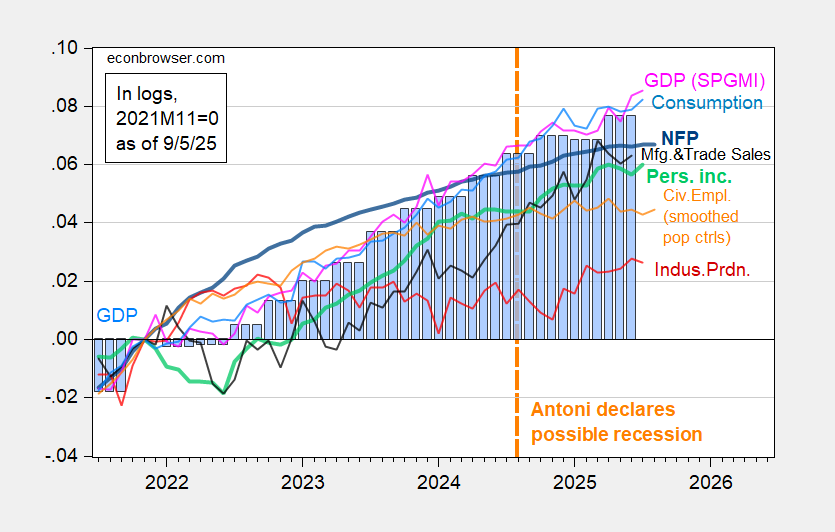 Figure 1: Nonfarm Payroll from CES (bold blue), civilian employment with smoothed population controls (orange), industrial production (red), Bloomberg consensus industrial production of 8/14, (red square), personal income excluding current transfers in Ch.2017$ (bold light green), manufacturing and trade sales in Ch.2017$ (black), consumption in Ch.2017$ (light blue), and monthly GDP in Ch.2017$ (pink), GDP (blue bars), all log normalized to 2021M11=0. Source: BLS via FRED, Federal Reserve, BEA 2025Q2 second release, S&P Global Market Insights (nee Macroeconomic Advisers, IHS Markit) (9/2/2025 release), and author’s calculations.