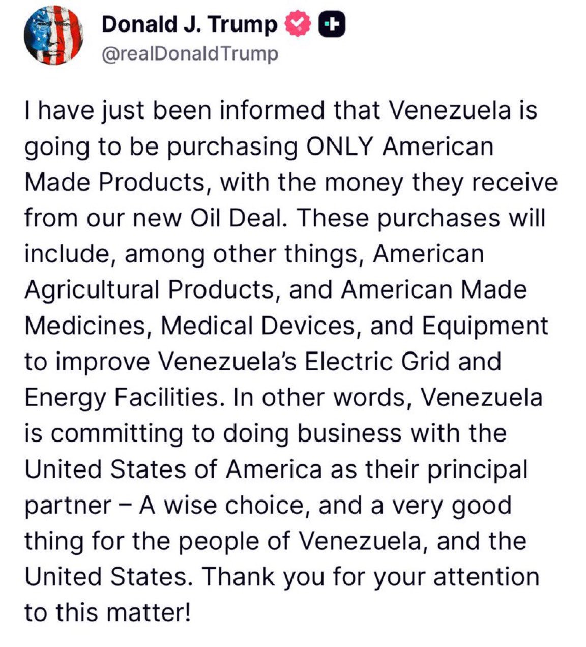 Venezuela, and by extension, all countries, are now being shown what it means to be living as a “sovereign country” and “a free economy in an American-led world” — by being attacked, having their head of state kidnapped, their resources plundered, and then being told to cut all ties with their other trade partners, and then spend all their remaining funds on “higher quality” US goods — all at the barrel of a gun.