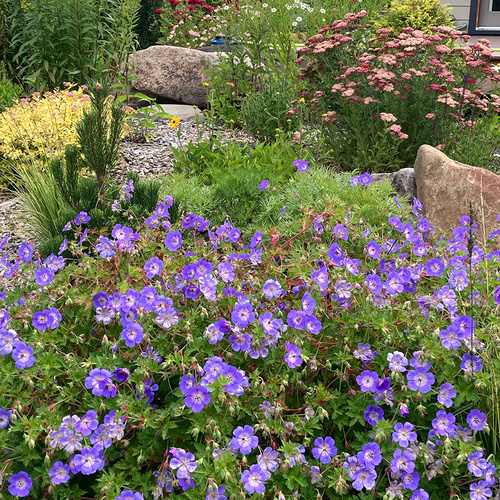 ‘Rozanne’ geranium (Geranium ‘Gerwat’, Zones 4–8) is usually rated as a Zone 5 plant (and I did lose one that wasn’t well mulched) but it grows into a massive plant that blooms profusely all summer and is covered in bees until heavy frosts take it down in October/November.