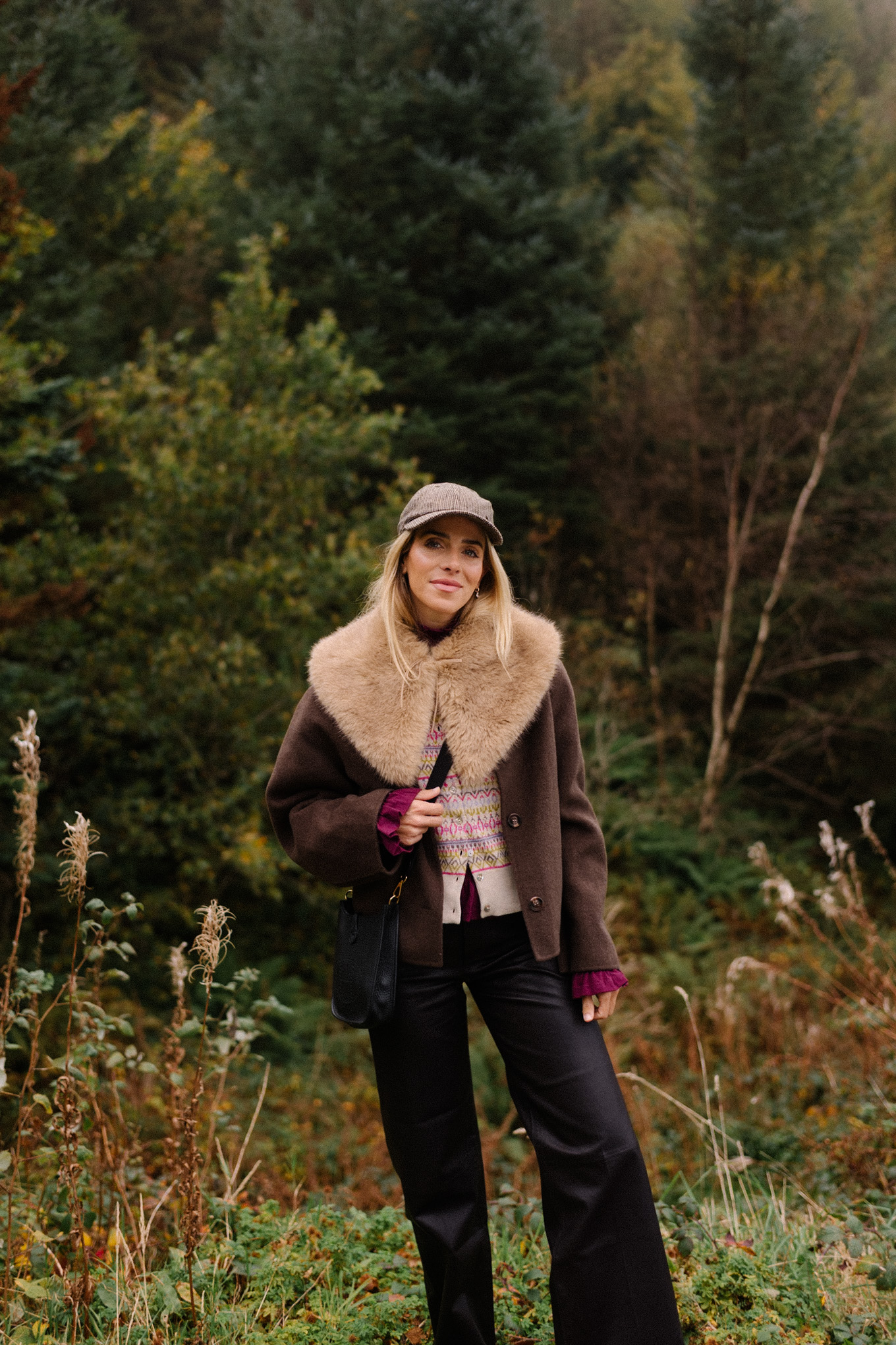 brown wool coat faux fur collar scarf black leather pants cashmere cardigan