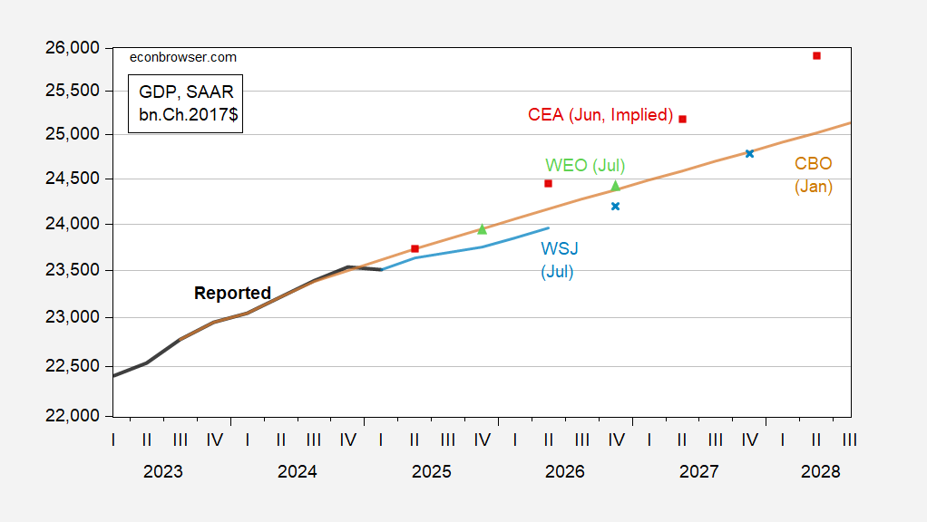 Figure 1: GDP (bold black), CBO current law projection of January (tan), implied CEA forecast using CBO current law (red squares), mean forecast from July WSJ survey (light blue line, x), July WEO (light green triangle), all in bn.Ch.2017$ SAAR. Source: BEA 2025Q1 3rd release, CBO January 2025, CEA (2025), WSJ survey, and author’s calculations.