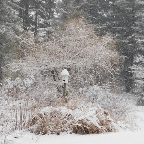 Enclosed you’ll find a few photos of my garden swathed in fresh, sparkling snow. I decided to leave the ornamental grasses standing this year, hoping they’ll provide a little winter buffet for the birds. You can see a few of the feathered visitors perched among the ornamental grasses. To watch their tiny heads bobbing as they peck at the seed heads is a simple pleasure, but watching them chew away at the winter chill always brings a smile to my face.