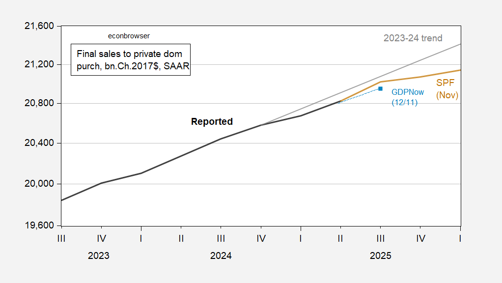 Figure 1: Final sales to private domestic purchasers (black), GDPNow nowcast (light blue square), November Survey of Professional Forecasters median (tan), 2023-24 stochastic trend (gray), all in bn.Ch.2017$ SAAR. Source: BEA, Atlanta Fed 12/11, Philadelphia Fed, and author’s calculations.
