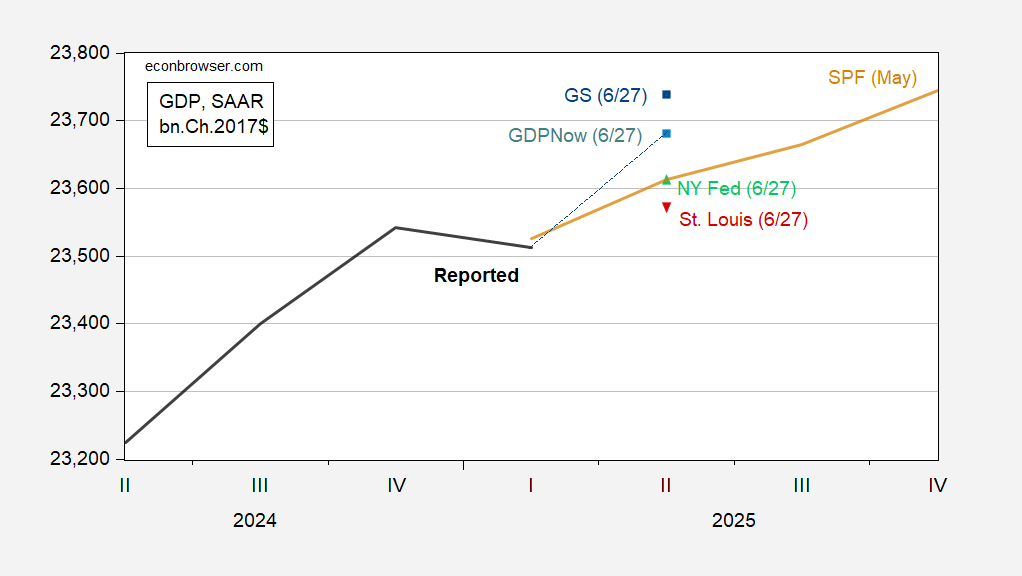 Figure 1: GDP (bold black), May SPF median (tan line), GDPNow (sky blue square), Goldman Sachs (blue square), NY Fed (green triangle), St. Louis News nowcast (inverted red triangle), all in bn.Ch.2017$, SAAR. Source: BEA 2025Q1 3rd release, Atlanta Fed, Goldman Sachs, NY Fed, St. Louis Fed, and author’s calculations.