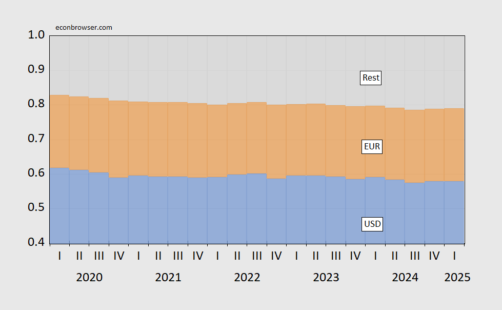 Figure 2: USD shares of fx and gold reserves (blue bars), EUR (tan), all other (gray), and gold (yellow). USD(EUR) share assumes 60%(35%) of unallocated reserves are in USD(EUR). Assumes quantity of gold holdings stay constant in 2025Q, and observed . Source: IMF COFER, World Gold Council, and author’s calculations.