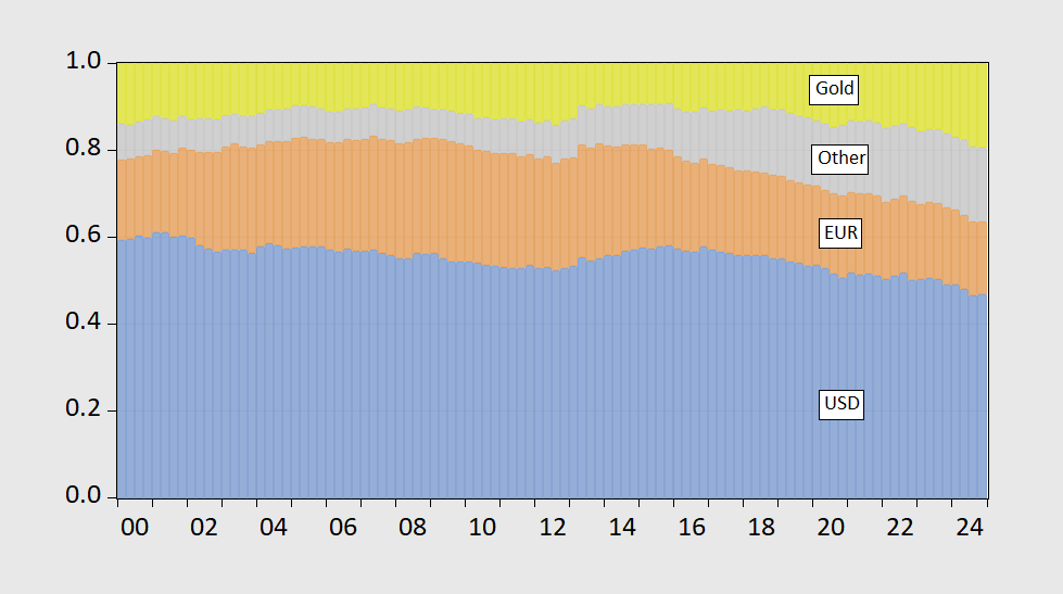There’s not much data on individual central bank holdings of the dollar through 2023, but COFER goes through 2024Q4, and gold holdings through 2025Q1.