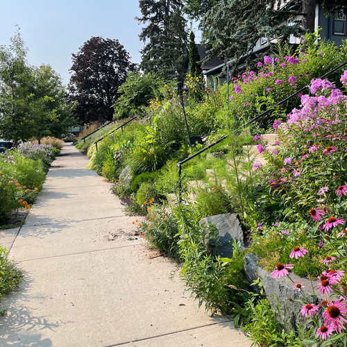 A garden is a great way to deal with a slope. On the main street that runs through our neighborhood, there are three houses in a row where the owners have turned not only their front yard but also the narrow boulevard into a botanical wonderland.