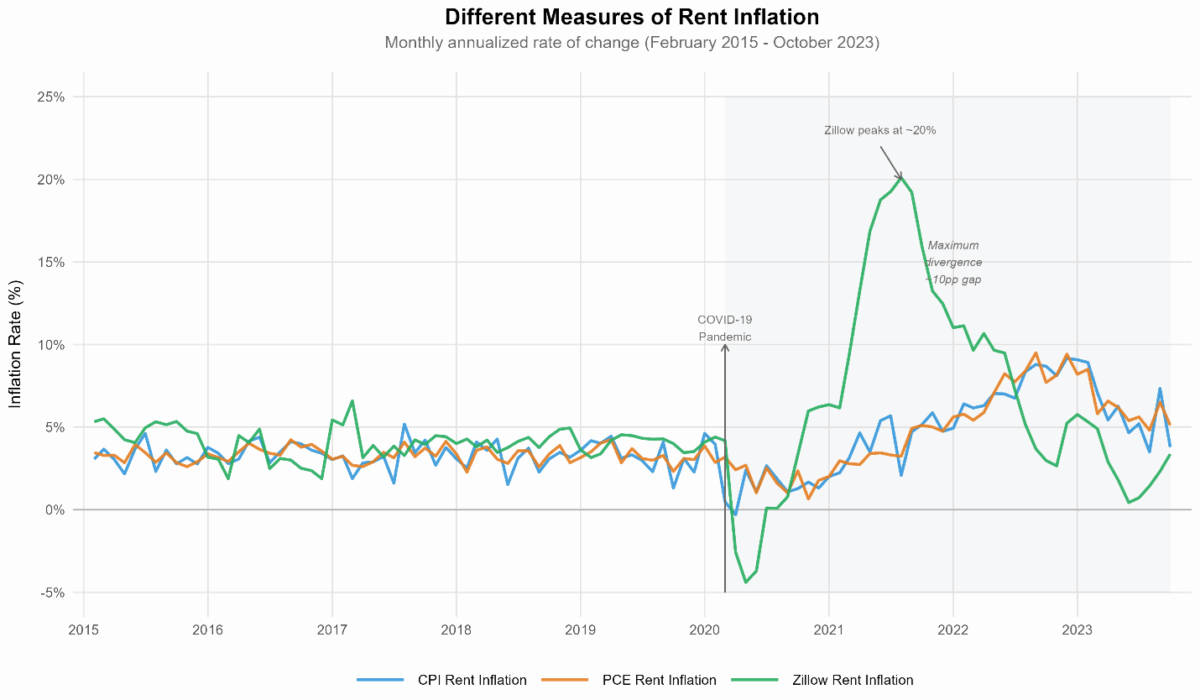 Figure 1: The three rent measures show strong divergence during 2021-2022, with Zillow rent inflation spiking to 20% while CPI rent remained below 10%.