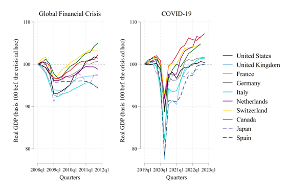 [2] The recession data in Figure 1, 2 has been estimated with the Bry-Boschan algorithm to determine the start of the recessions for each country. The real GDP has been recalculated to an index equal to 100 as of 2008q1 for the GFC and as of 2019q1 for the COVID-19 crisis.