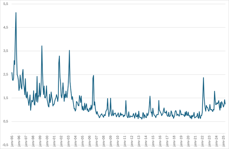 In policy terms, the future evolution of consumer prices will depend on the amplitude of a possible structural shock estimated by the geopolitical index from Bondarenko et al. Let’s assume that the amplitude is as large as the one observed during the war in Iraq, that is a value of 5.5 in 2003q1 (see Figure 2), representing about 3.7 times the standard deviation of the shock. Such a geopolitical event would likely generate a surplus of inflation of about 3.7*0.25=0.93pp after 8 quarters. If we translate the quarterly profile into annual figures, this would shift upward inflation in 2027 to about 2.5%, adding thus inflationary pressures to the baseline scenario for France (1.8% in 2027 according to Banque de France).