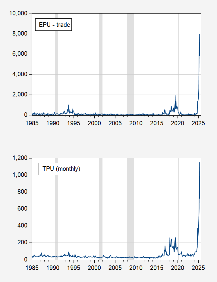Figure 1: Top panel – Economic Policy Uncertainty – trade category (blue); Bottom panel – Trade Policy Uncertainty (blue). NBER defined peak-to-trough recession dates shaded gray. Source: policyuncertainty.com, Iacoviello, NBER.