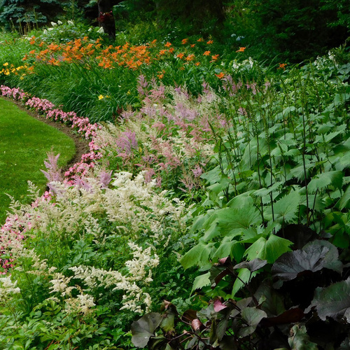 The next 3 photos are from mid-June to mid-July. A perennial border subtly changes in blooms, from astilbes to lilies to ligularia.