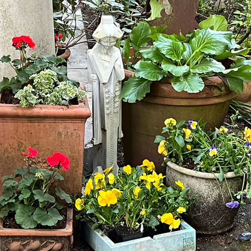 So here are a few pictures of my pots, plants, and yard art.