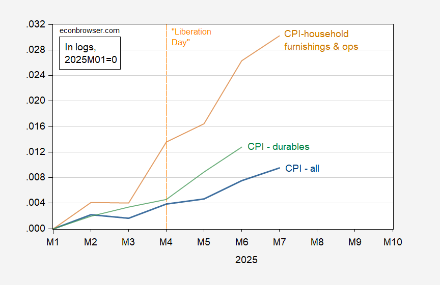 Figure 1: CPI all urban (bold blue), CPI – household furnishings and operations (tan), CPI – final demand, consumer durables (green), all in logs 2025M01=0. Source: BLS via FRED, author’s calculations.
