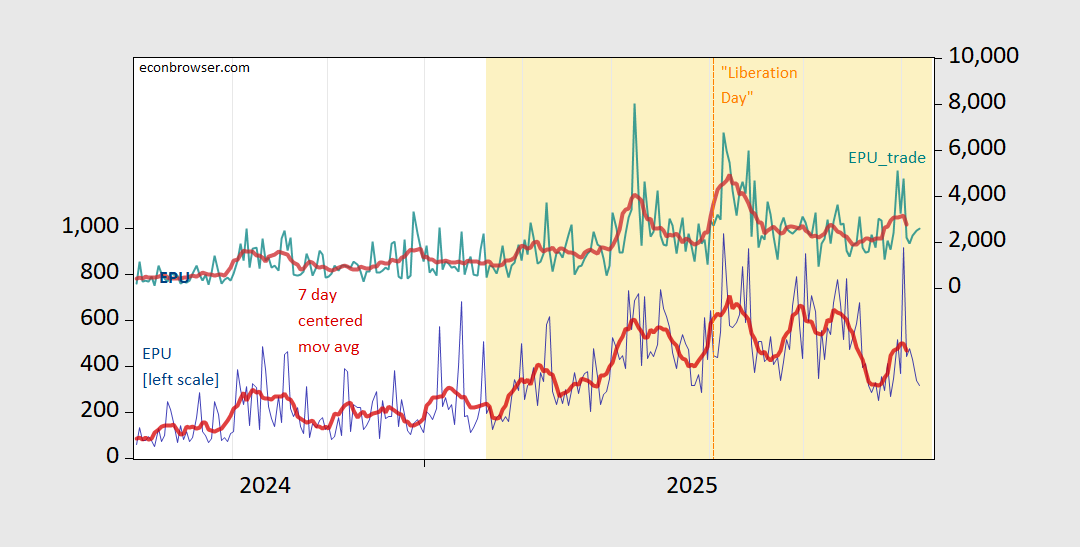 Figure 1: EPU (blue, left scale), EPU 7 day centered moving average (dark red, left scale), EPU-trade (teal, right scale), EPU-trade 7 day centered moving average (red, right scale). Source: policyuncertainty.com.