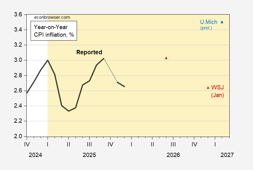 Figure 1: Year-on-Year CPI inflation (bold black), U.Michigan February survey mean (prel.) (light blue square), WSJ January survey mean (red triangle), all in %. Source: BLS, U.Michigan, WSJ, and author’s calculations.