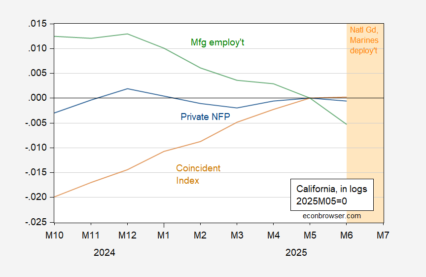 Figure 1: California private nonfarm payroll employment (blue), manufacturing (green), and coincident index (tan), all in logs, 2025M05=0. Source: BLS via FRED, BLS, Philadelphia Fed, and author’s calculations.