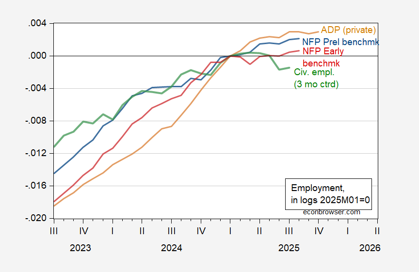 Figure 1: Implied NFP preliminary benchmark (blue), NFP early benchmark, using latest changes for extended forecast period (red), civilian employment – experimental series using smoothed population controls, 3 month centered moving average (green), and ADP private NFP (tan), all in logs, 2025M01=0. October ADP figure is Bloomberg Consensus. Source: BLS, ADP via FRED, BLS, Philadelphia Fed, and author’s calculations.