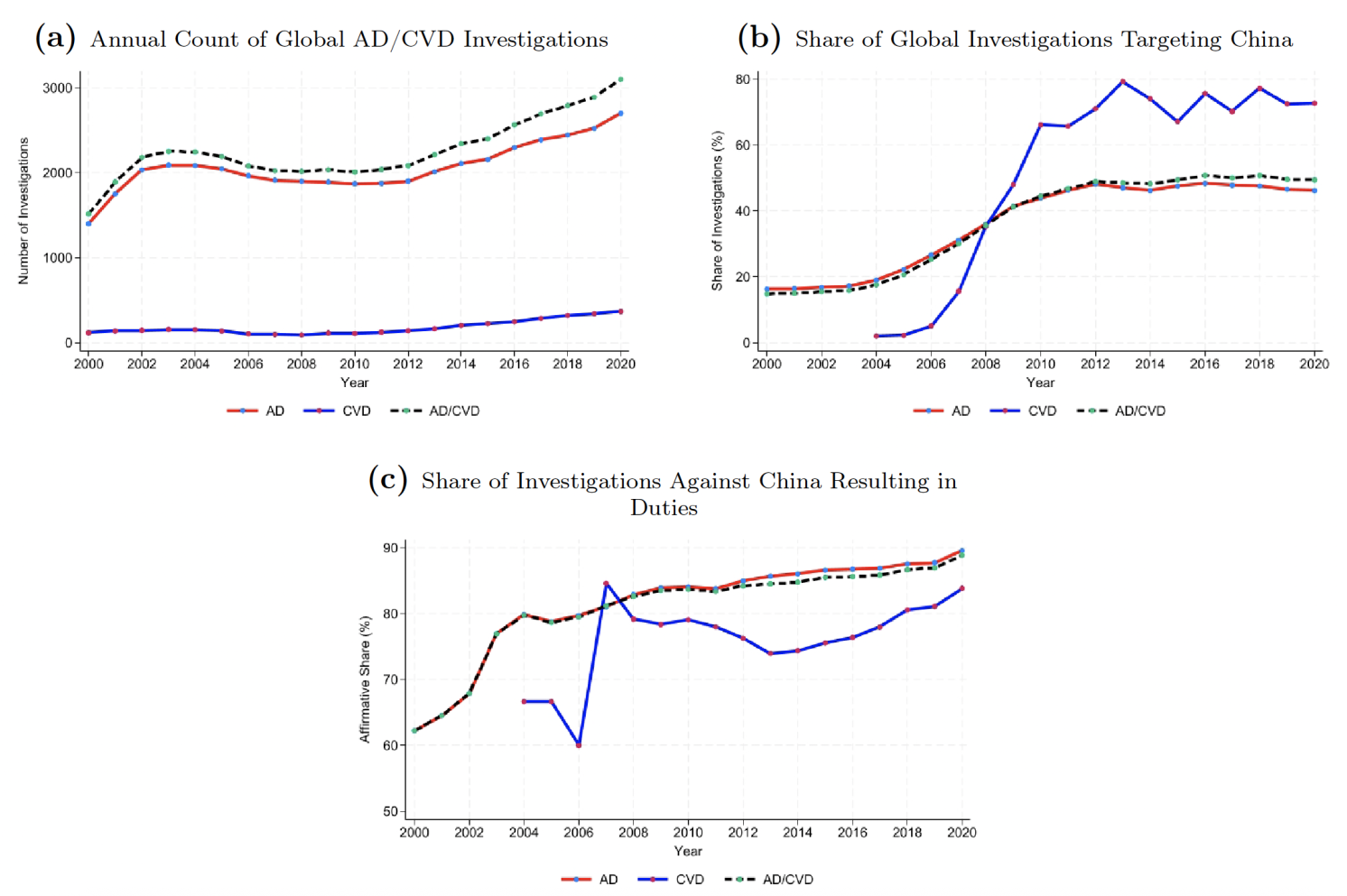 Notes: Figure 1 illustrates trends in global AD/CVD investigations from 2000 to 2020. Panel (a) reports the annual count of investigations worldwide. Panel (b) displays the share of these investigations that targeted China. Panel (c) presents the share of investigations against China that resulted in affirmative outcomes (i.e., the imposition of duties).